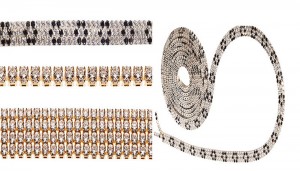 • Two fully automatic machines which complement each other for the production of high quality cup chain. Flat calibrated strip is fed to the CCM which stamps the individual cup and its connecting rod. Assembly of the two pieces is carried out continuously forming a uniform chain of empty cups with prongs open. For extra strength a laser can be applied for spot welding the cups closed. The chain can then be processed (diamond cut, coloured etc.). The processed cup chain is then fed to the MMP2, into which the stones have been loaded and via a vibrating hopper delivers them to the insertion tooling for positioning the stones into the waiting cups of the chain. The insertion action also closes the prongs around the stone. The new MMP2 model is able to handle 2 different colour stones (optional kit), positioning them in any desired sequence.