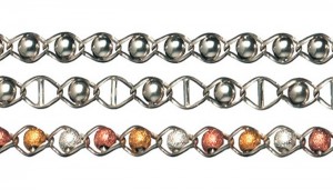 Fully automatic machine for the application of beads/balls directly into an anchor (gucci) chain. The unit takes anchor chain from a spool and automatically selects a bead from one of the 3 vibrating hoppers and inserts it onto the link bar. The beads (which have 2 holes) are left free to rotate within the link. The chain may also then be curbed directly after inserting the bead. The 3 vibrating hoppers can manage 3 different colour/shape beads which are sequenced into the chain based on the program inserted in the machine by the operator. Even beads without holes can be mounted by caging them inside the link after it has been curbed. MIP1 version has only 1 hopper.Technical features Max. production speed 30 beads/min Bead sizes min – max 2.6 – 6.0 mm Chain link width max 8.7 mm Punch cutting power 125 kg Technical data Voltage (three phase) 400 V 50/60 Hz Power 6.1 kW Compressed air 46 l/min (filtered) at 7 bar Dimensions 86 x 66 x 211(h) cm –410 kg Packing 100 x 200 x 100 (h) cm (approx)
